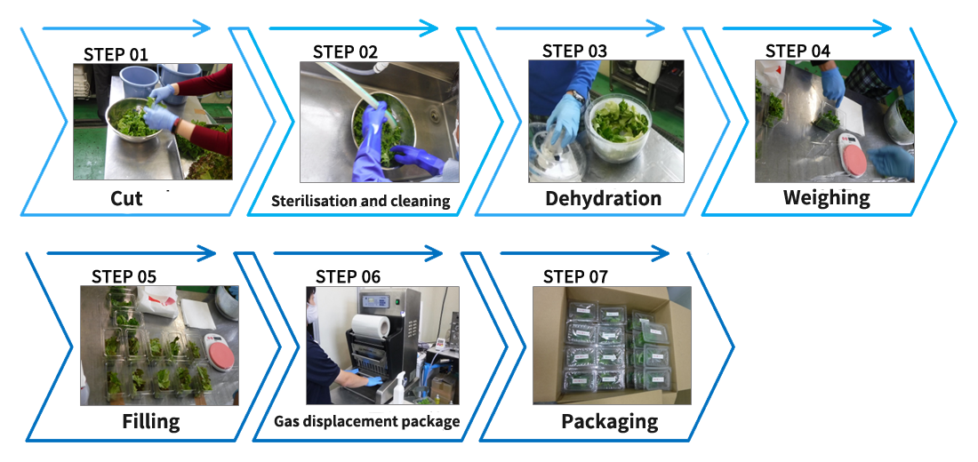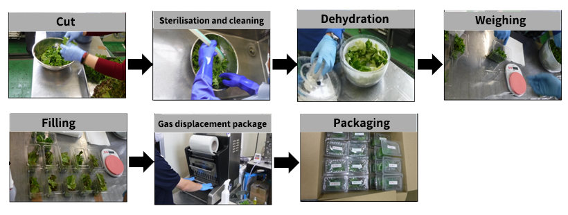 Lettuce to be tested is cut, sterilized and washed (once), dehydrated, weighed, filled, and gas displacement packaged to prepare samples. After packaging, the samples are stored refrigerated at 5°C. The testing period was from the day after the packaging date to 10 days later, and a total of five tests were conducted.